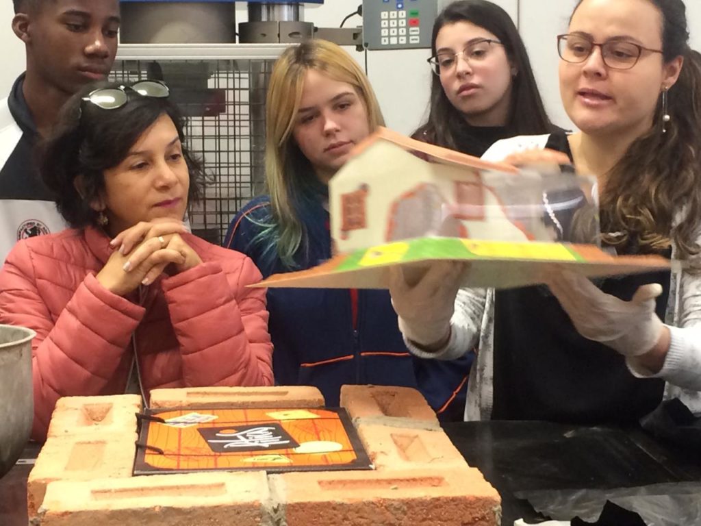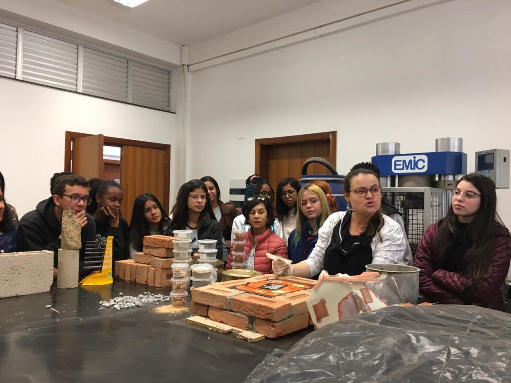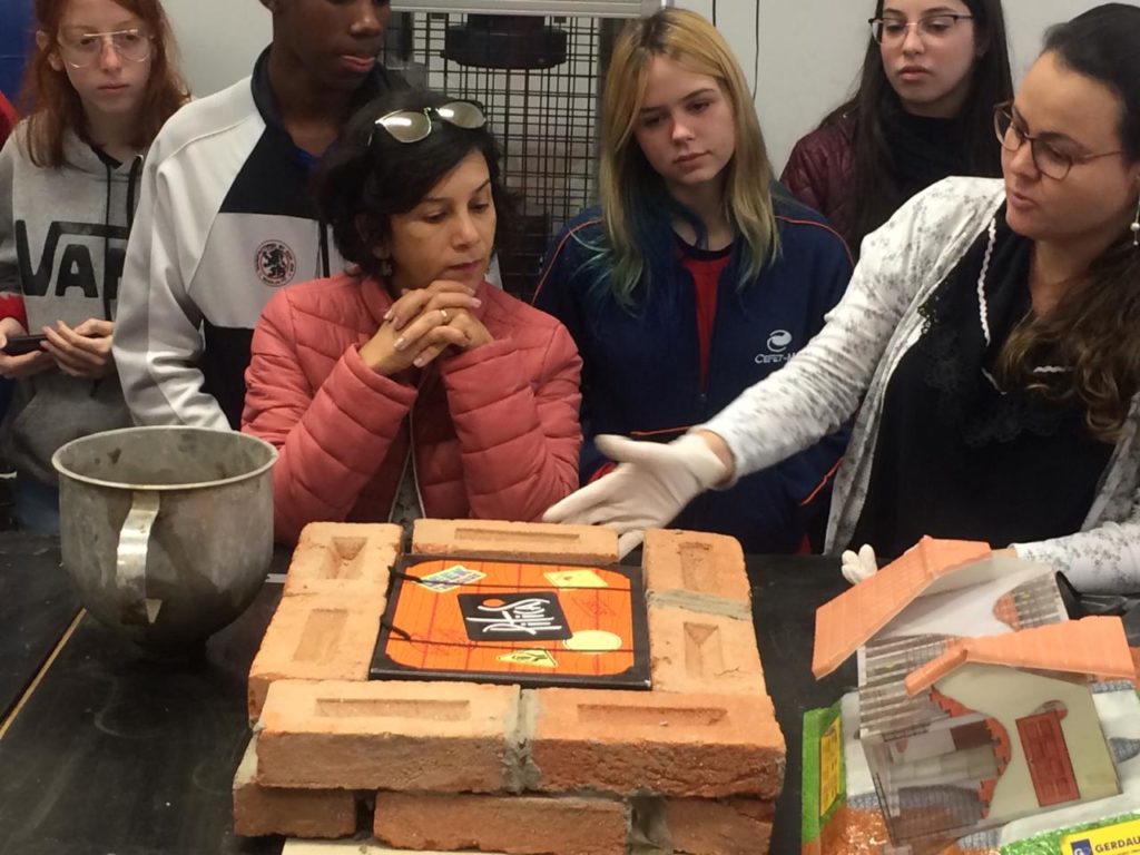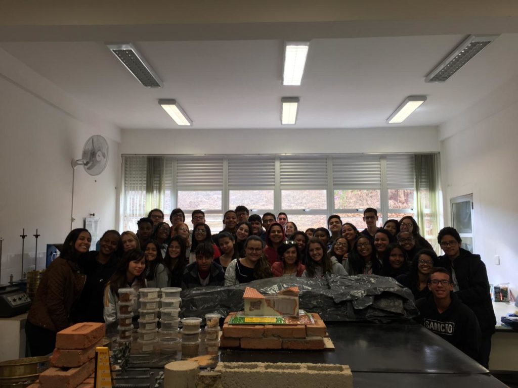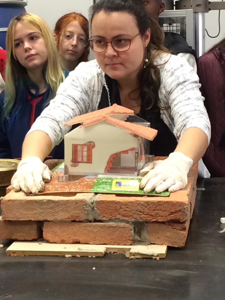 No laboratório de materiais, com a turma do primeiro Edificações e a profa. Mag Geisielly, na produção e fechamento da maquete de alvenaria contendo as cartas dos estudantes