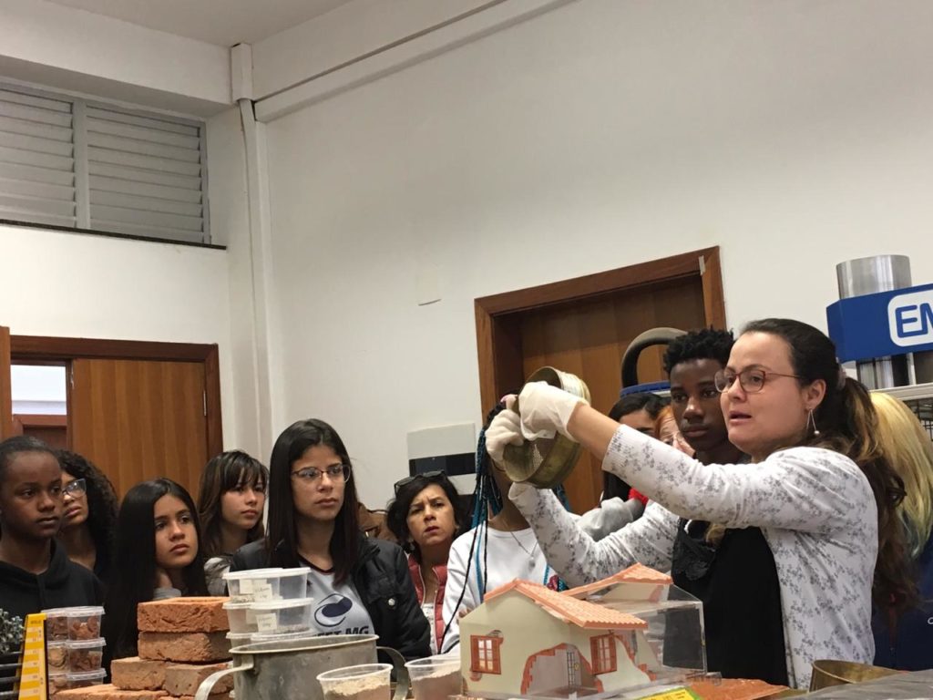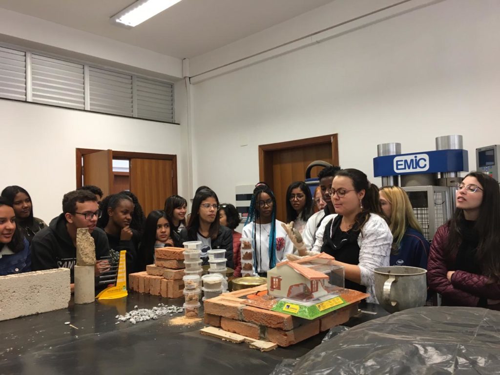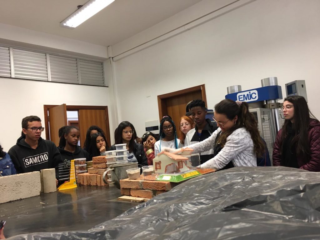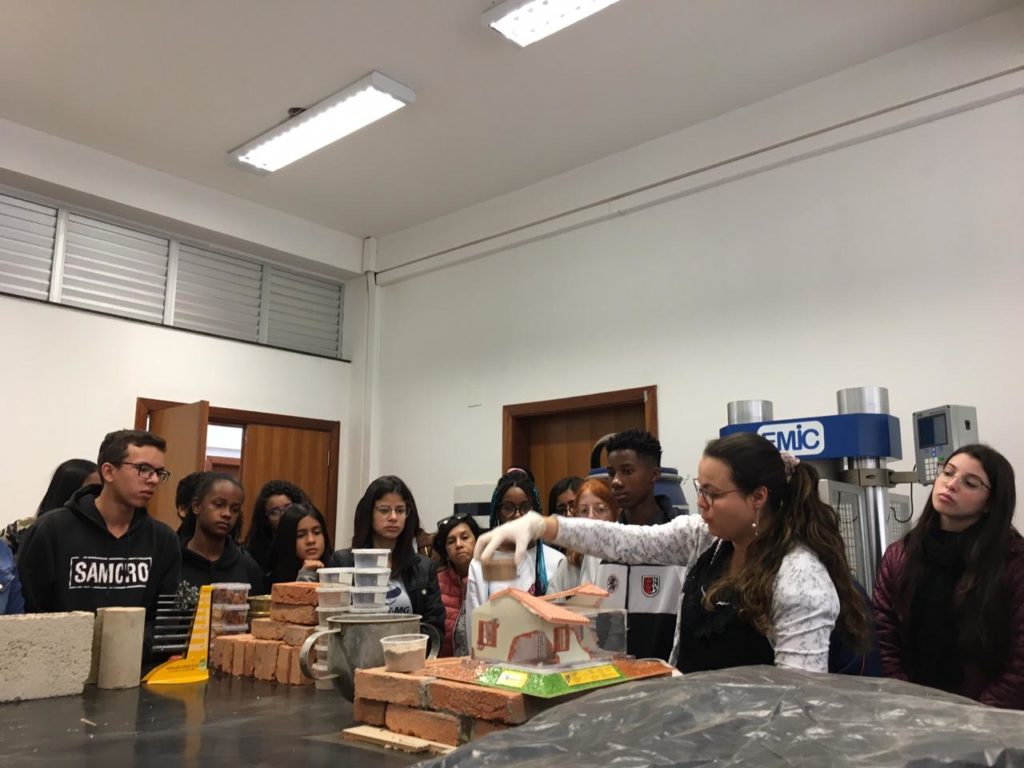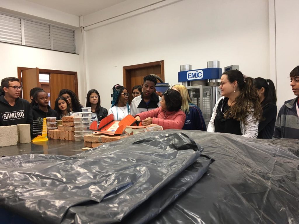 No laboratório de materiais, com a turma do primeiro Edificações e a profa. Mag Geisielly, na produção e fechamento da maquete de alvenaria contendo as cartas dos estudantes