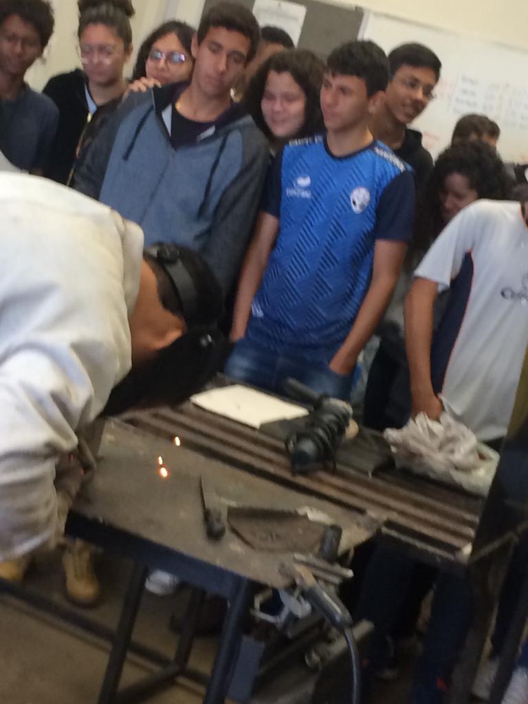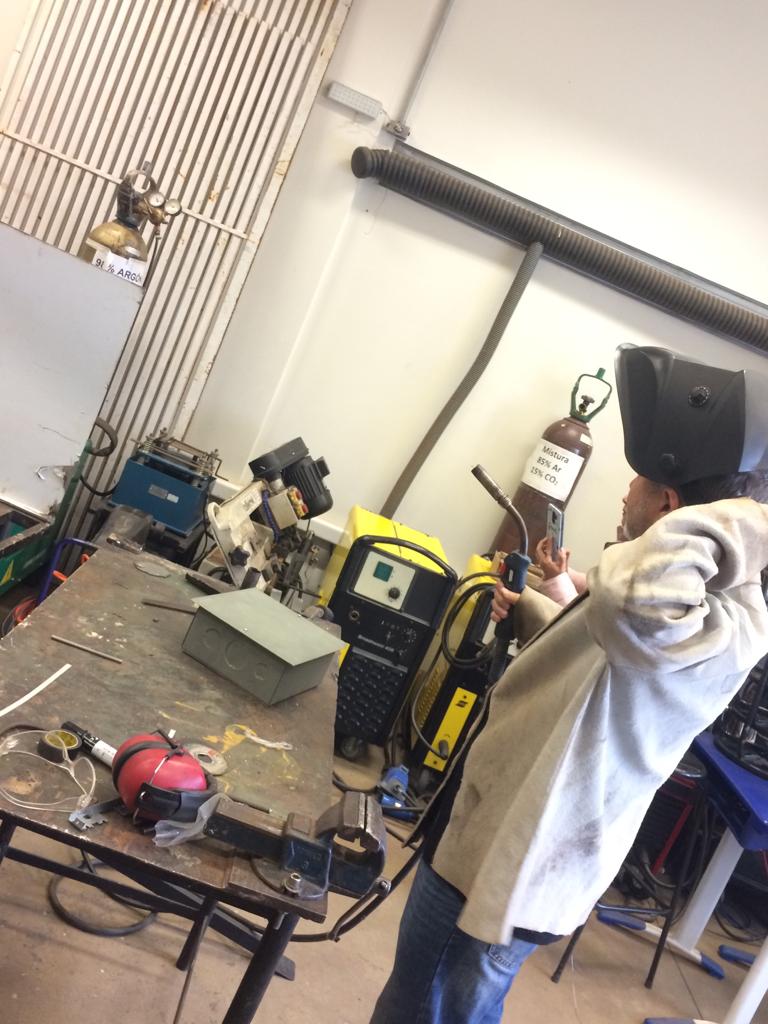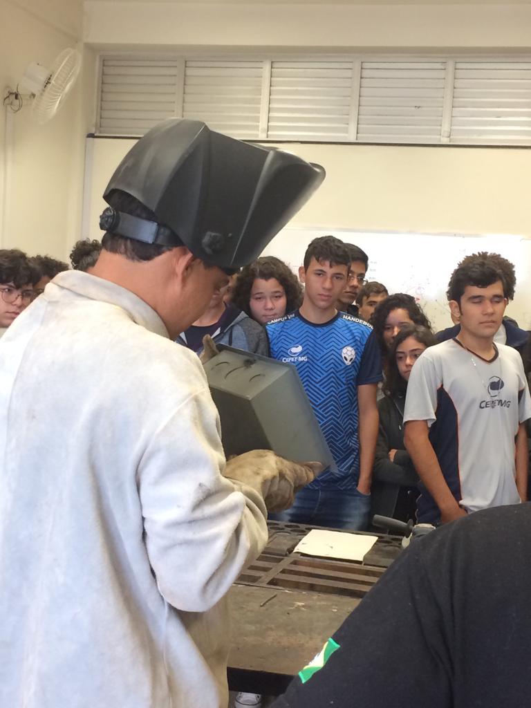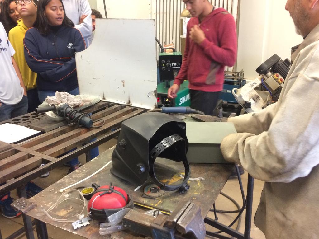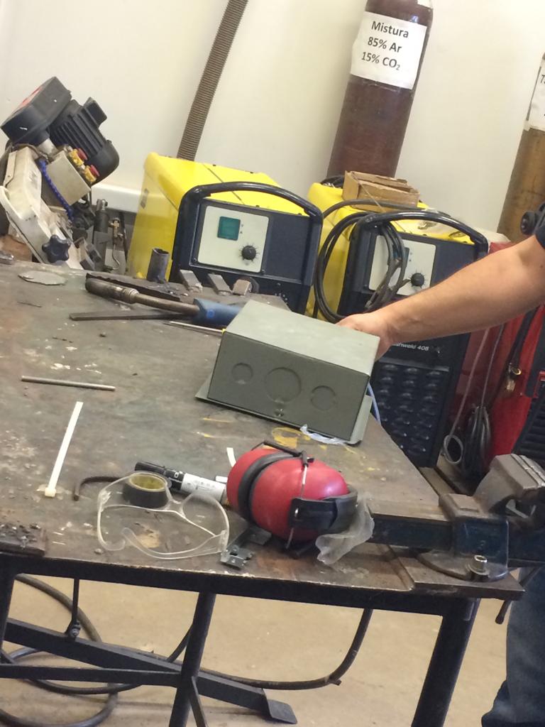 No laboratório de solda, com a turma do primeiro Mecatrônica, o prof. Carlos e Técnico Eduardo, na preparação e soldagem da caixa de metal contendo as cartas dos estudantes.