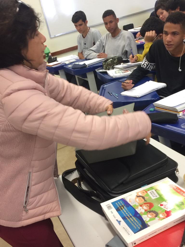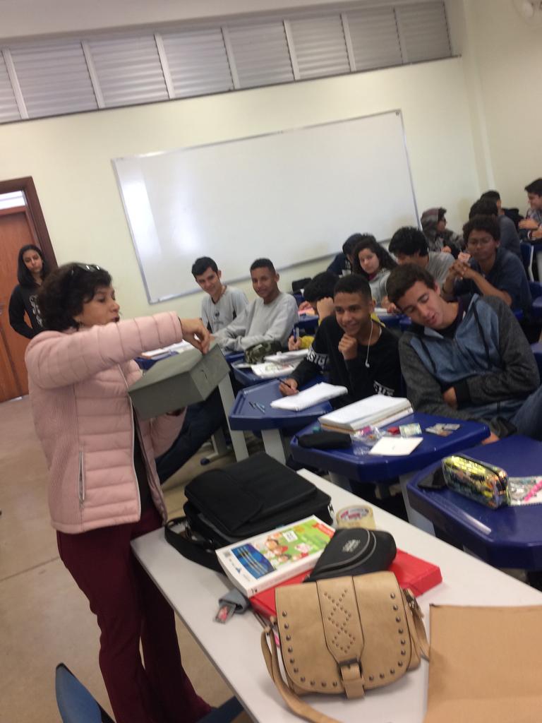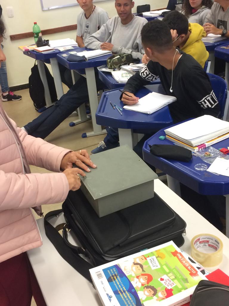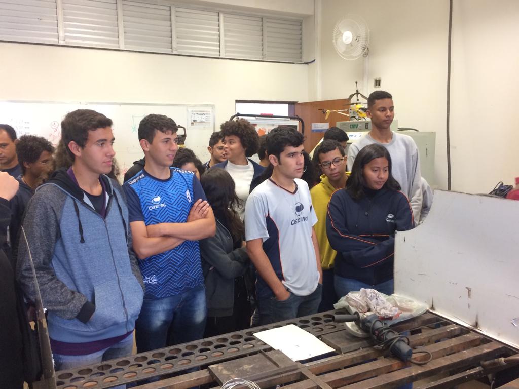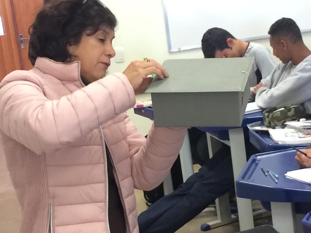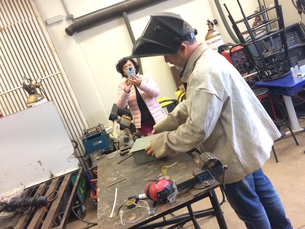 No laboratório de solda, com a turma do primeiro Mecatrônica, o prof. Carlos e Técnico Eduardo, na preparação e soldagem da caixa de metal contendo as cartas dos estudantes.