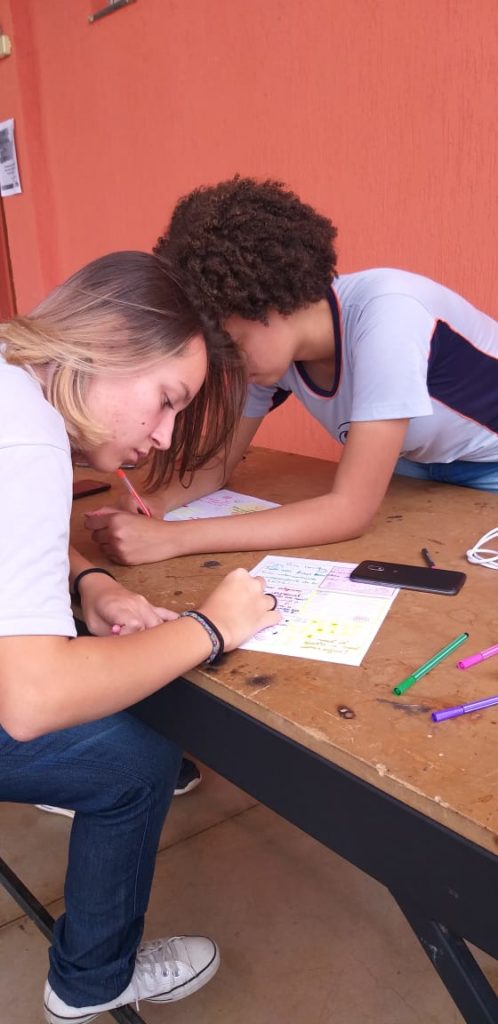 Estudantes da unidade Varginha em produção voluntária de cartões e bilhetes a serem entregues na recepção do centro de oncologia em Varginha, em 2019.